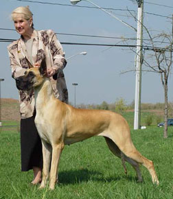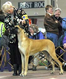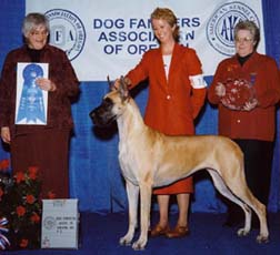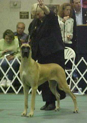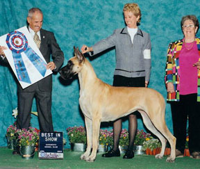 ch harley d hardt's hell on wheels, took the breed over an entry of 70 danes (9 specials) on 3.29.03 under Judge Ms. Sharol Candace Way. |